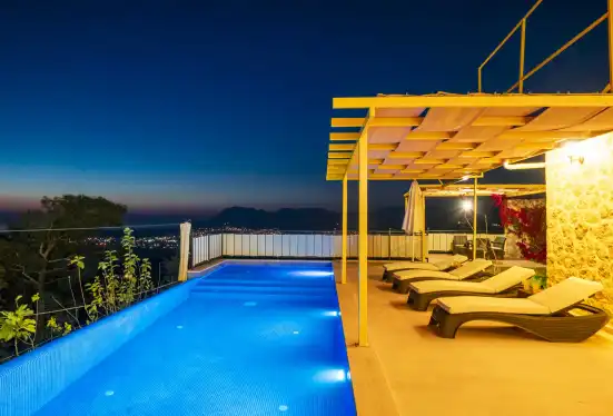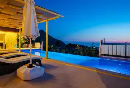 Kalkan' ın muhteşem doğasında şehir kargaşasından uzak bir tatil geçirmenizi sağlayacak olan villamızın havuz ve bahçe kısmında kapasiteye uygun oturma grubu, şezlong takımı, barbekü alanı, masa tenisi; havuz terasına açılan, her ayrıntısı özenle tasarlanmış ferah bir oturma odası ve tam donanımlı açık mutfağı bulunmaktadır.