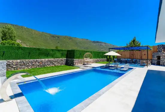 Kalkan'ın muhteşem doğasında şehir kargaşasından uzak bir tatil geçirmenizi sağlayacak olan villamızın havuz ve bahçe kısmında kapasiteye uygun oturma grubu, şezlong takımı, barbekü alanı, havuz terasına açılan, her ayrıntısı özenle tasarlanmış ferah bir oturma odası ve tam donanımlı açık mutfağı bulunmaktadır.