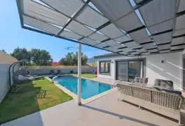 Doğa içinde bulunan villada kapasiteye uygun oturma alanı, şezlong takımı, barbekü alanı, çocuk havuzu ve salıncak; havuz terasına açılan konforlu oturma odası, ihtiyaçlarınızı karşılayacak donanımlı mutfağı bulunmaktadır. Bir yatak odasında çift kişilik yatak, ebeveyn banyosu, jakuzi; diğer yatak odasında bir çift kişilik yatak ve bir tek kişilik yatak, ebeveyn banyosu bulunmaktadır.