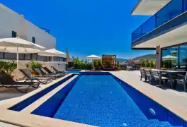 Kalkan'ın muhteşem doğasında şehir kargaşasından uzak bir tatil geçirmenizi sağlayacak olan villamızın havuz ve bahçe kısmında kapasiteye uygun oturma grubu, şezlong takımı, barbekü alanı, masa tenisi, langırt ; havuz terasına açılan, her ayrıntısı özenle tasarlanmış ferah bir oturma odası ve tam donanımlı açık mutfağı bulunmaktadır.