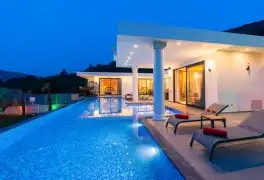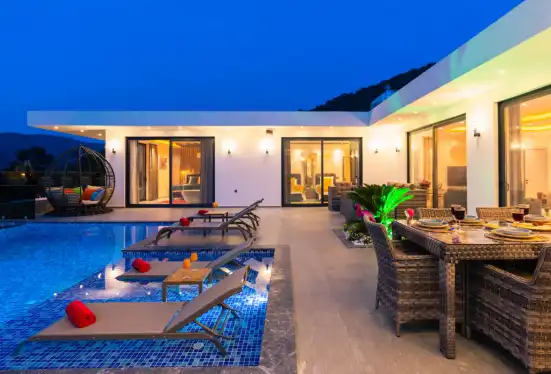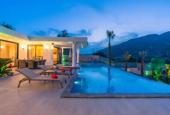 Villamızda jakuzi, küvet, çoçuklar için oyun alanı (sandalye,masa, kitap,oyuncaklar), sinema odası, masa tenisi, langırt, playstation, küçük çoçuk parkı ( kaydırak ve salıncak), büyük çocuk parkı( kaydırak, salıncak, tahterevalli, futbol kalesi, basketbol potası), havuz başında barbekü, nargile, oturma grubu, yemek masası, apple yatak bulunmaktadır. Villamızın büyük havuzunda çoçuk havuzu, jakuzisi ve şelalesi bulunmaktadır. Villamız 400 m² çim alana sahiptir. Kalkan şehir merkezine 15 dakikalık yol mesafesindedir. Villamızın havuzu korunaklı olup muhteşem bir doğa manzarasına sahiptir. Villamızın alt kısmında ise spa merkezi bulunmaktadır.