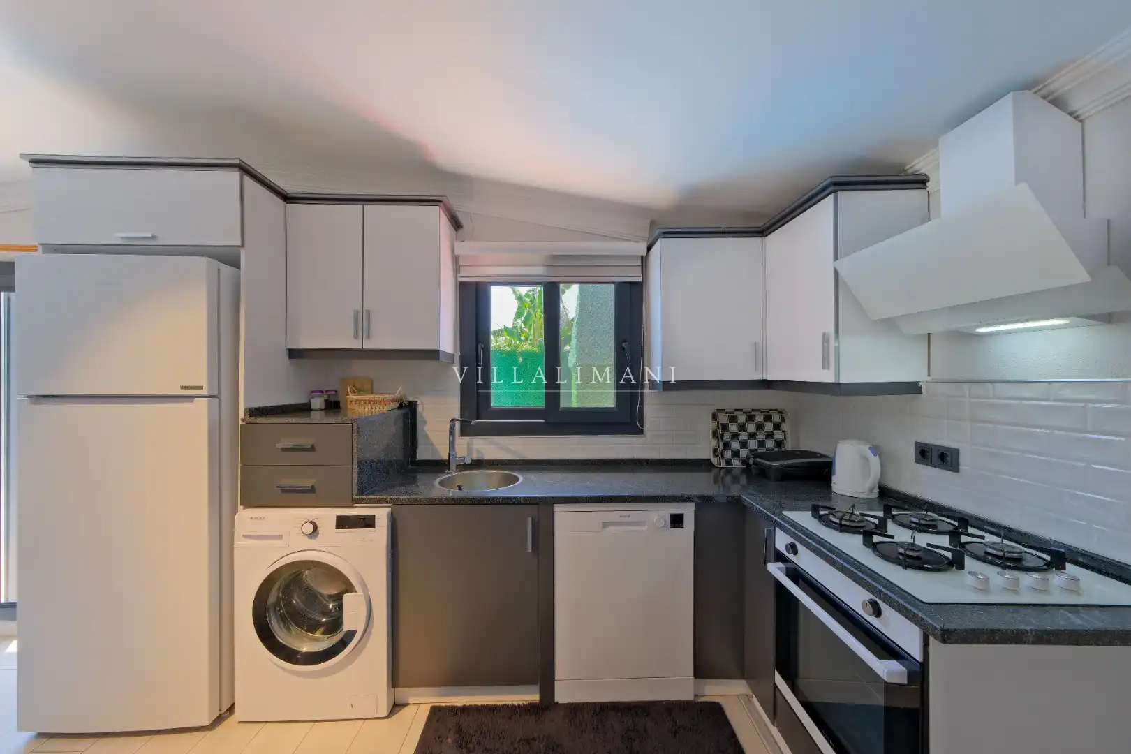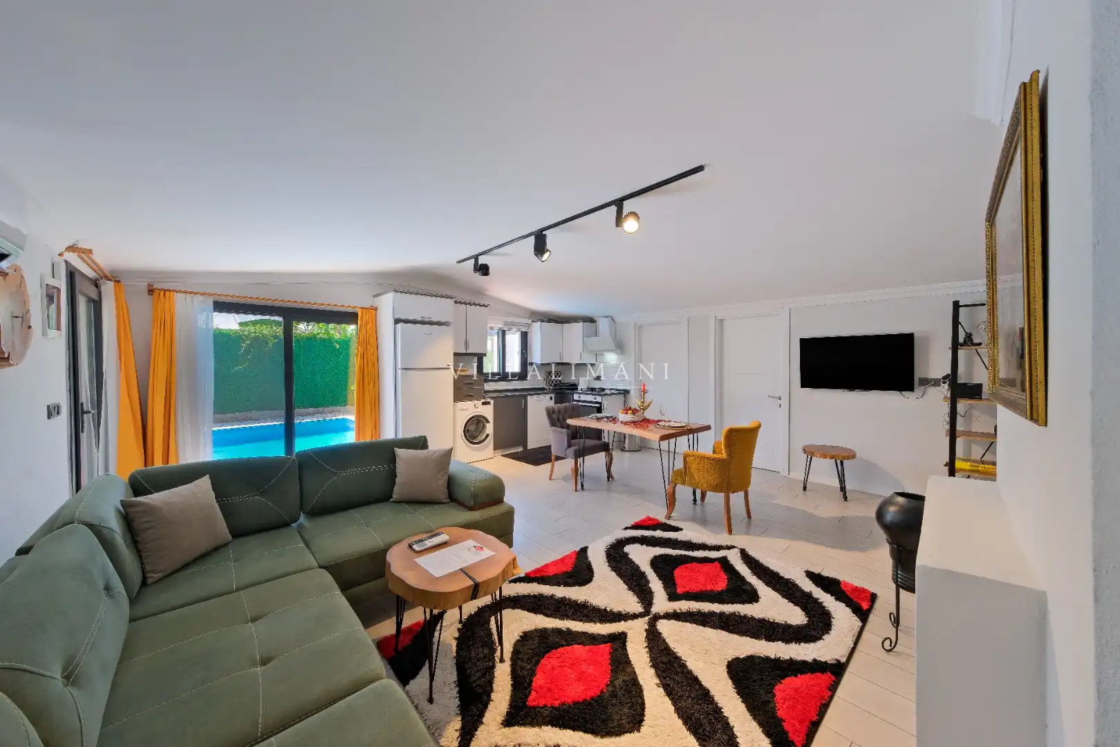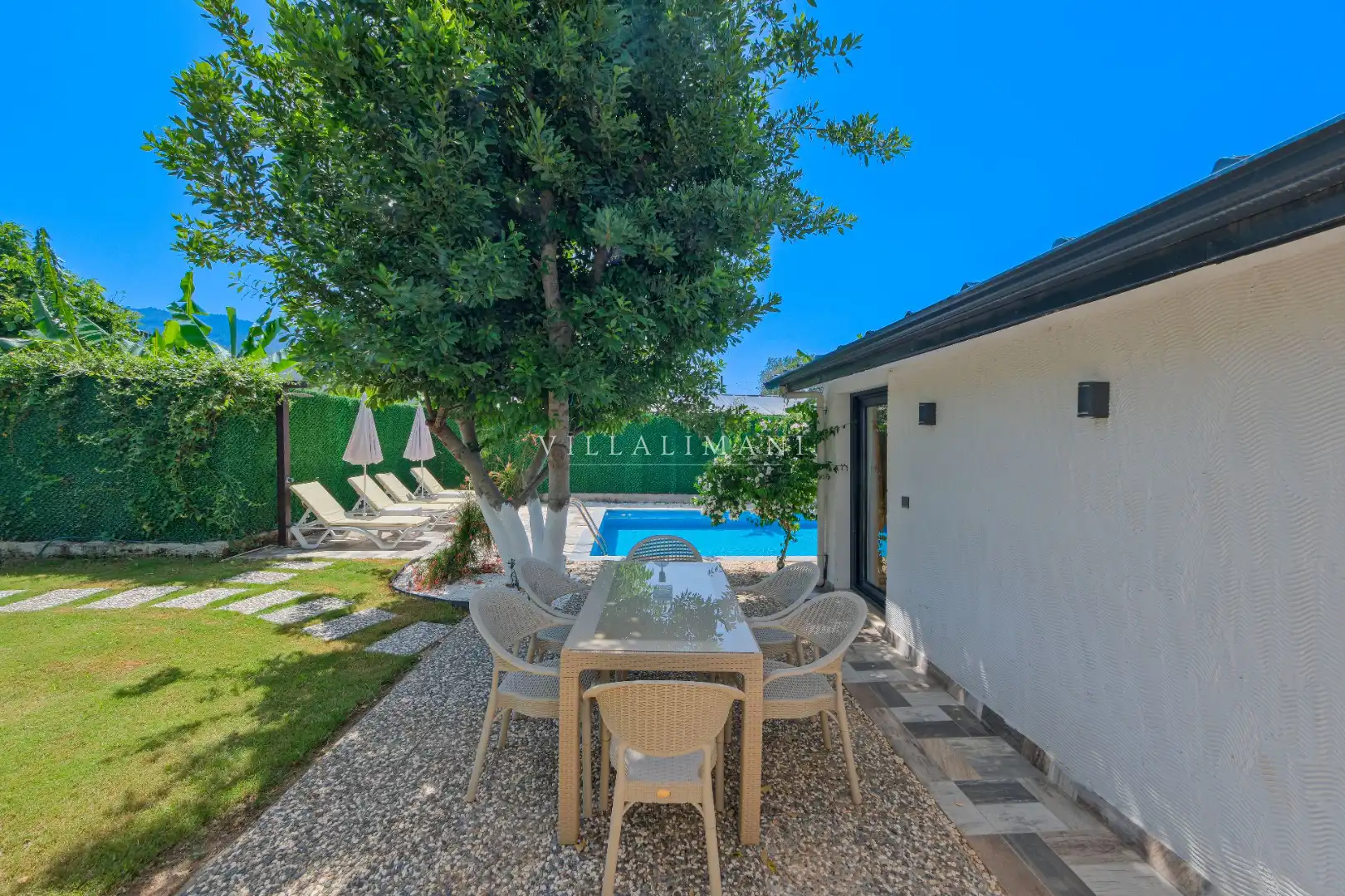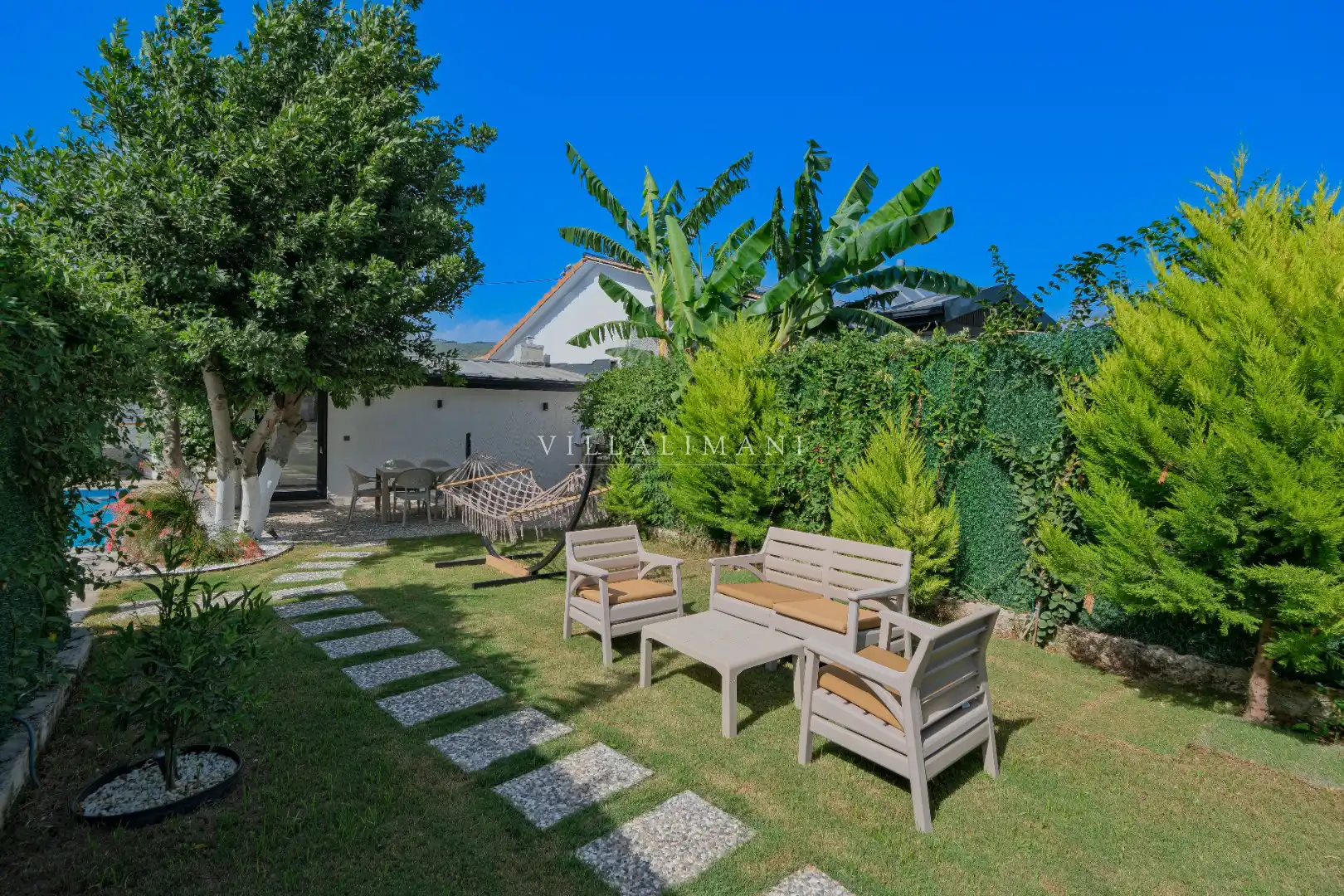Fethiye'nin muhteşem doğasında şehir kargaşasından uzak bir tatil geçirmenizi sağlayacak olan villamızın havuz ve bahçe kısmında kapasiteye uygun oturma grubu, şezlong takımı, barbekü alanı mevcutur. Ayrıca havuz terasına açılan, her ayrıntısı özenle tasarlanmış ferah bir oturma odası ve tam donanımlı açık mutfağı bulunmaktadır.