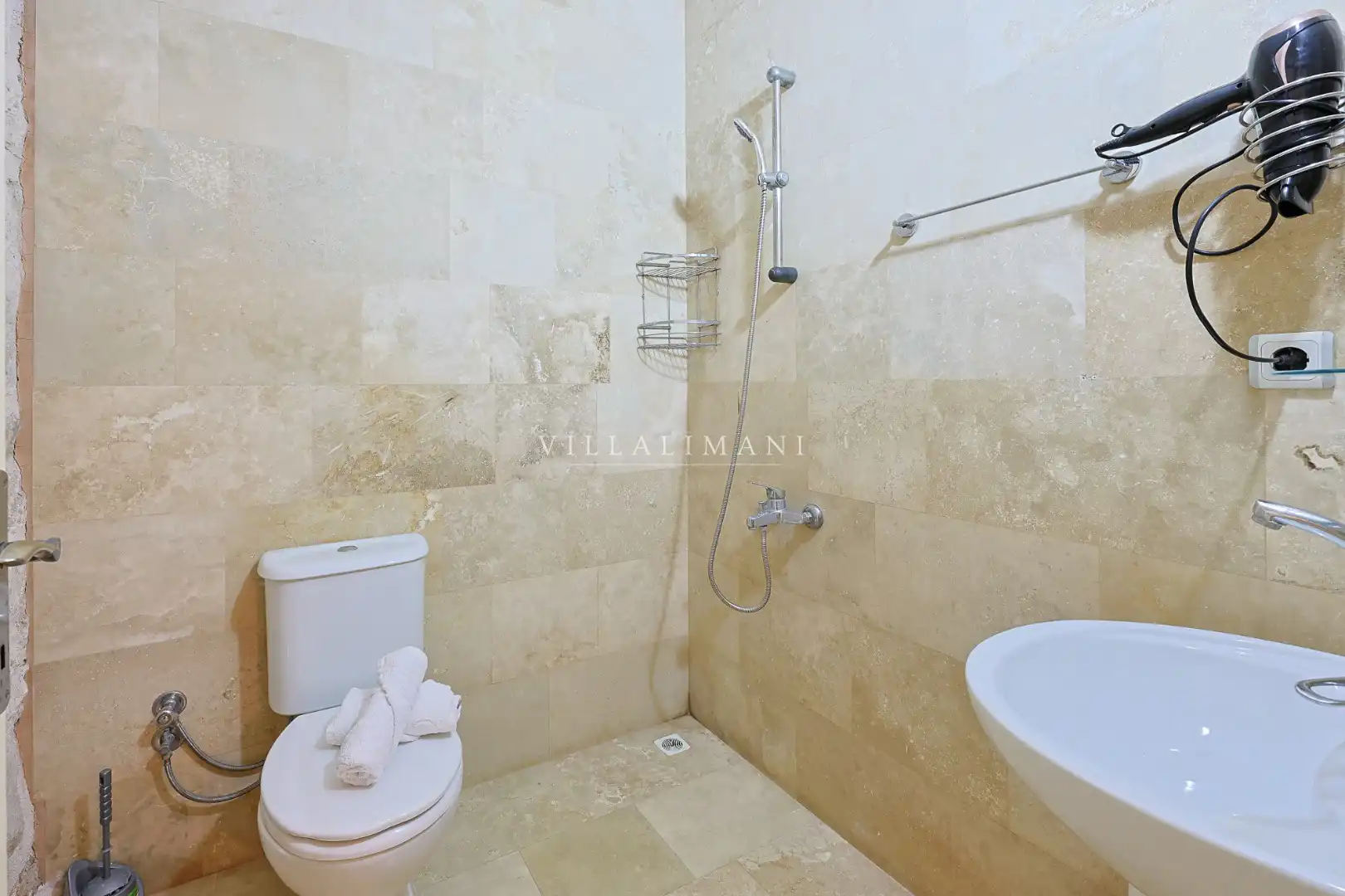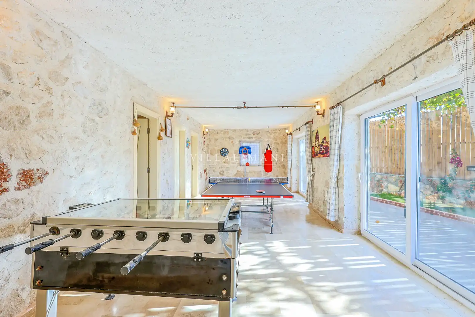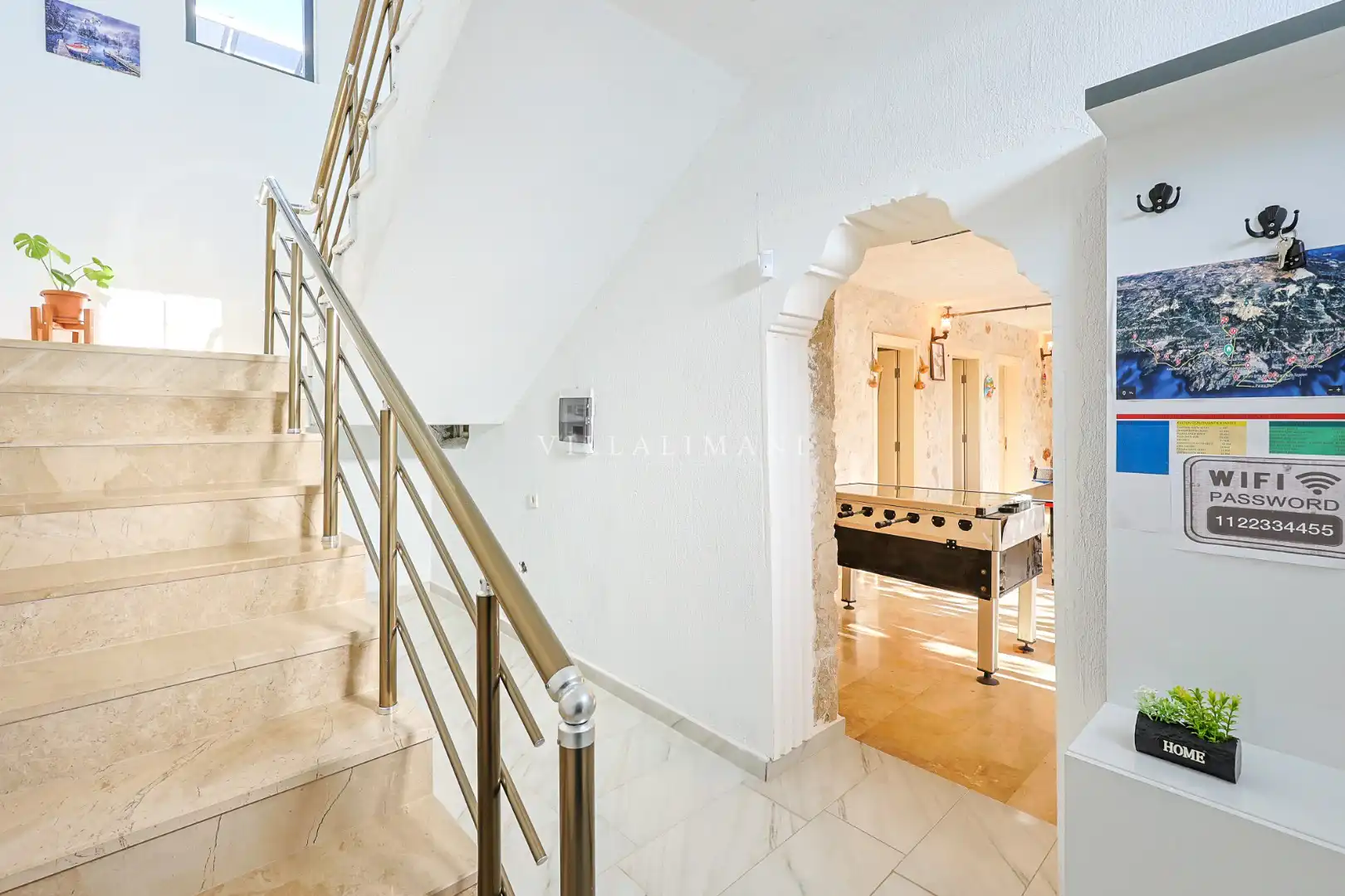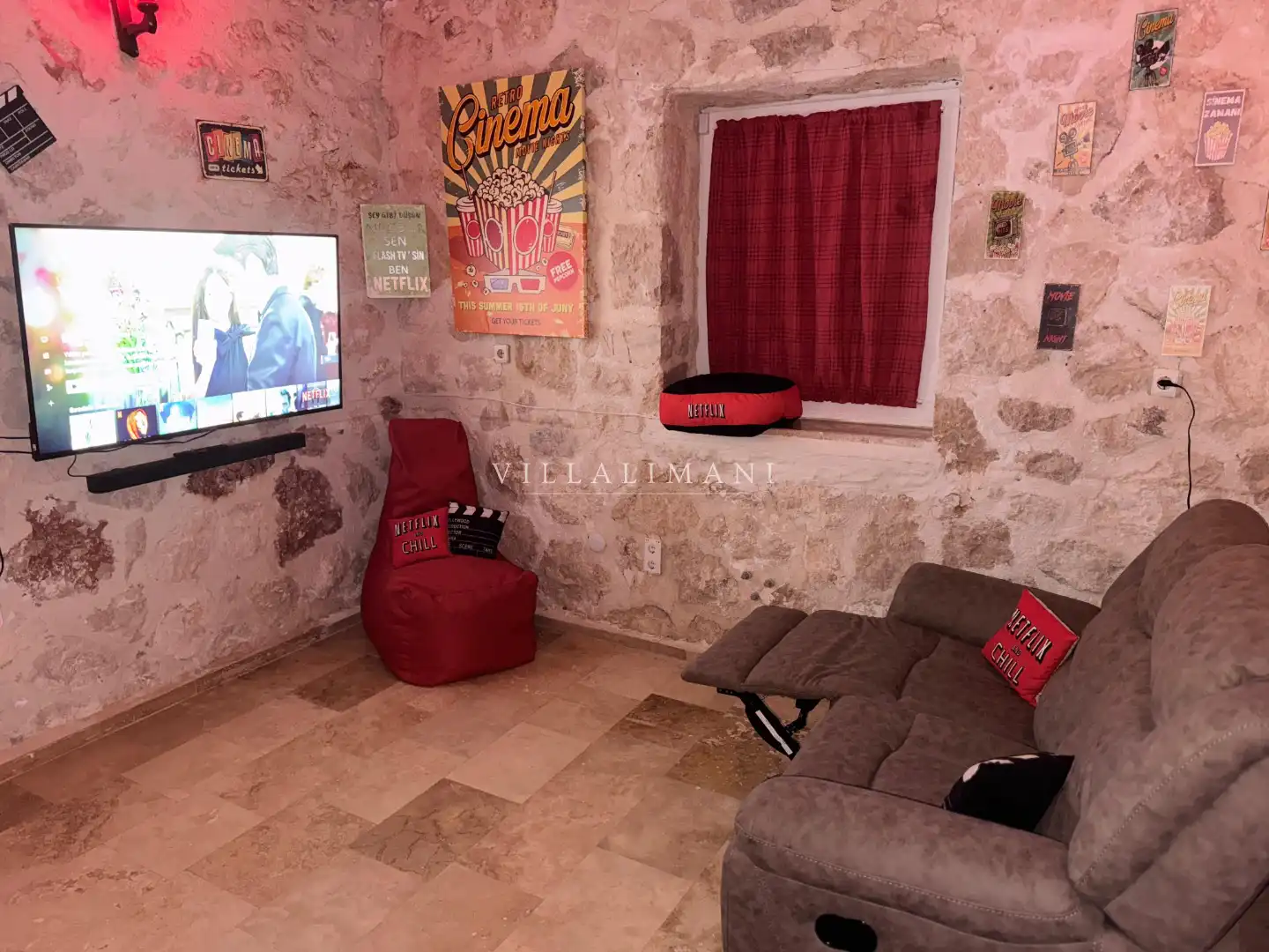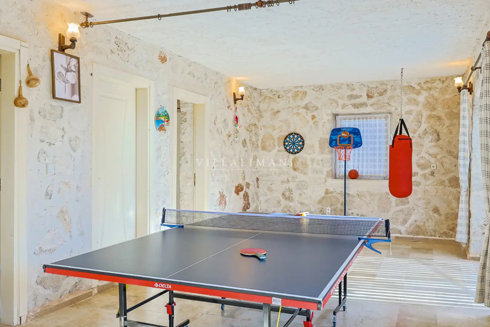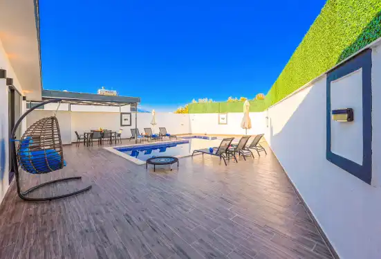 Korunaklı ve geniş bahçe alanına sahip olan villada, kapasiteye uygun oturma alanı, şezlong takımı, havuz terasında açılan konforlu oturma odası, ihtiyaçlarınızı karşılayacak donanıma sahip mutfağı ve masa tenisi, langırt, sinama odası bulunmaktadır. Birinci yatak odasında çift kişilik yatak, ebeveyn banyosu ve jakuzi; ikinci yatak odasında çift kişilik yatak, ebeveyn banyosu; üçücü yatak odasında ise iki tek kişilik yatak ve evebeyn banyosu bulunmaktadır.Villamızda