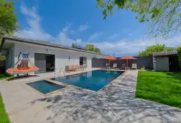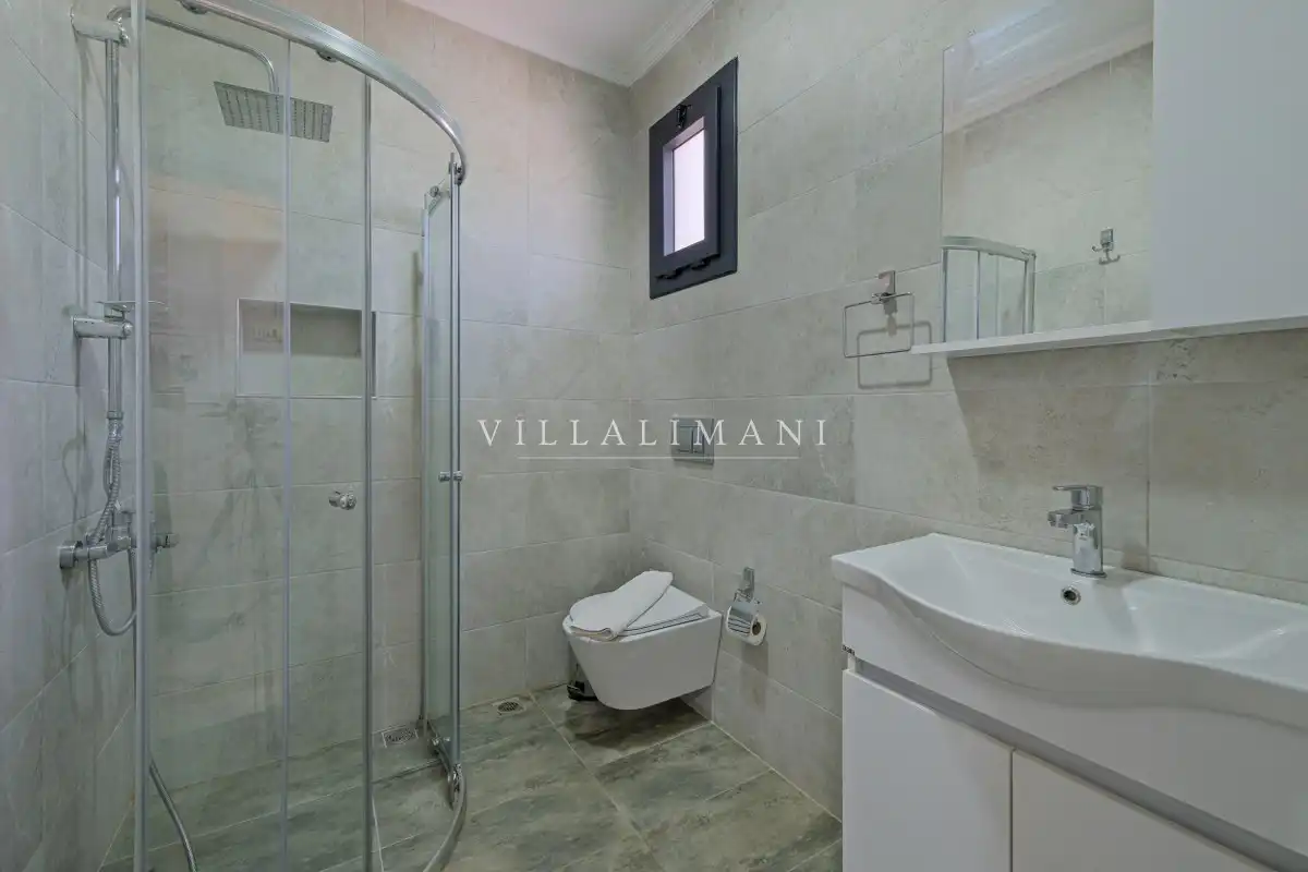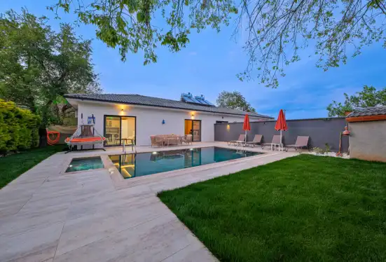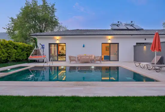 Havuz terasında kapasiteye uygun şezlong takımı, konforlu oturma grubu barbekü bulunmaktadır. Konforunuz gözetilerek tasarlanmış olan muhafazakar havuz alanına açılan ferah oturma odası, tam donanımlı açık mutfak; bir yatak odasında çift kişilik yatak, ebeveyn banyosu; ikinci yatak odasında da iki tek kişilik yatak ve ebeveyn banyosu bulunmaktadır. Villa, ihtiyaçlarınıza tam karşılık verecek donanıma sahiptir.