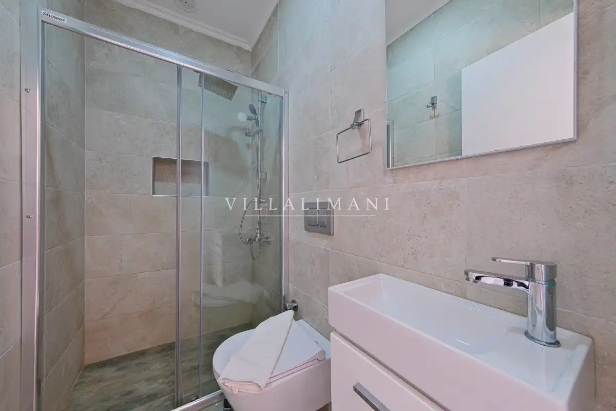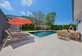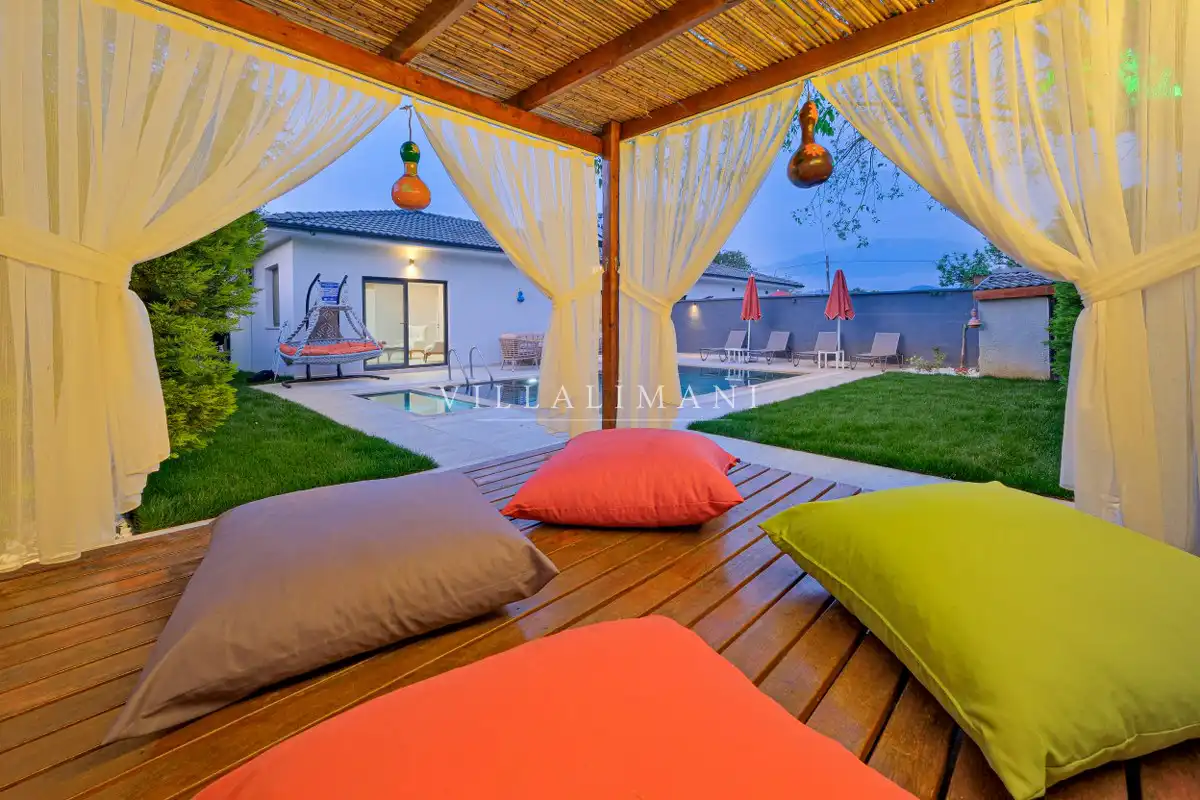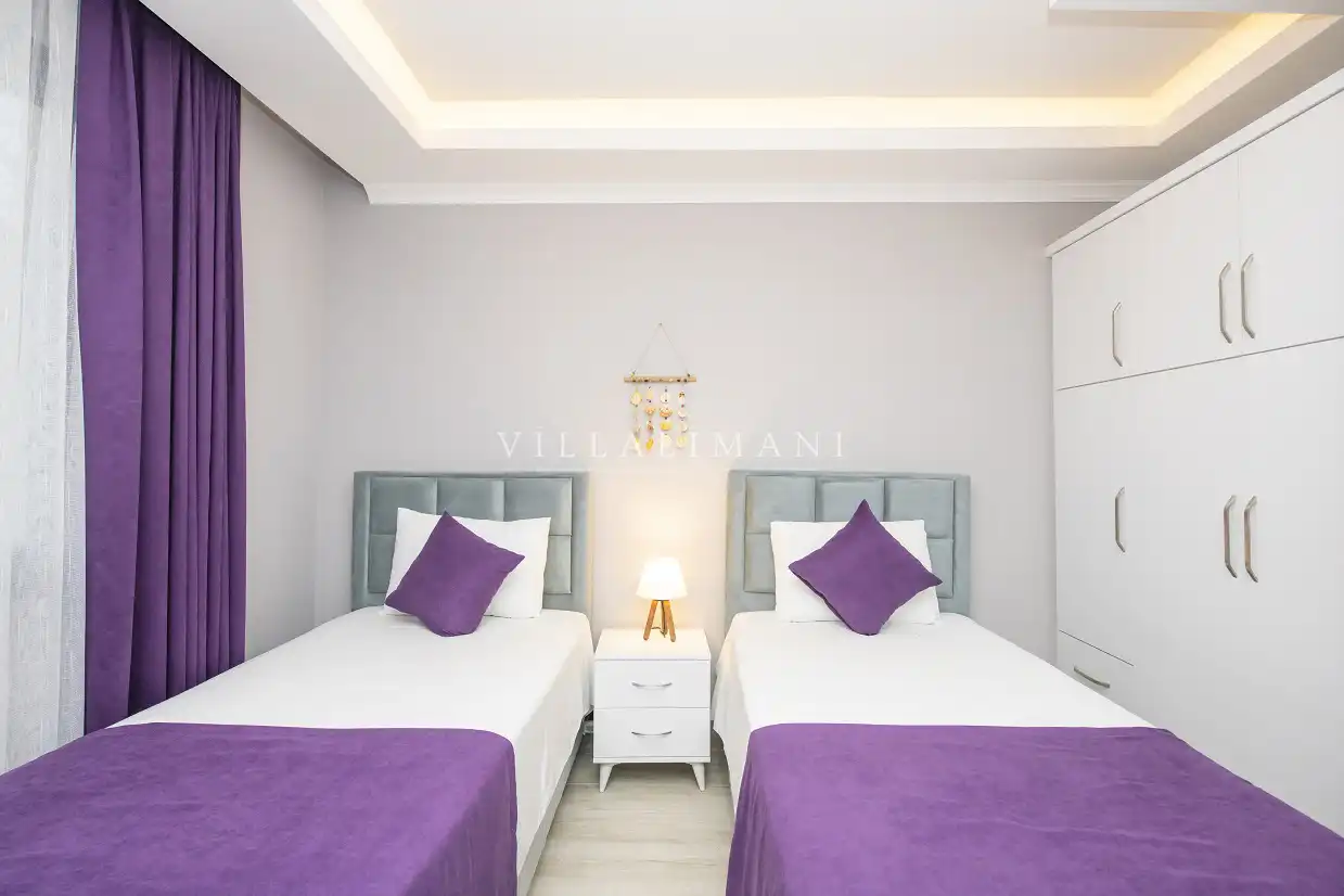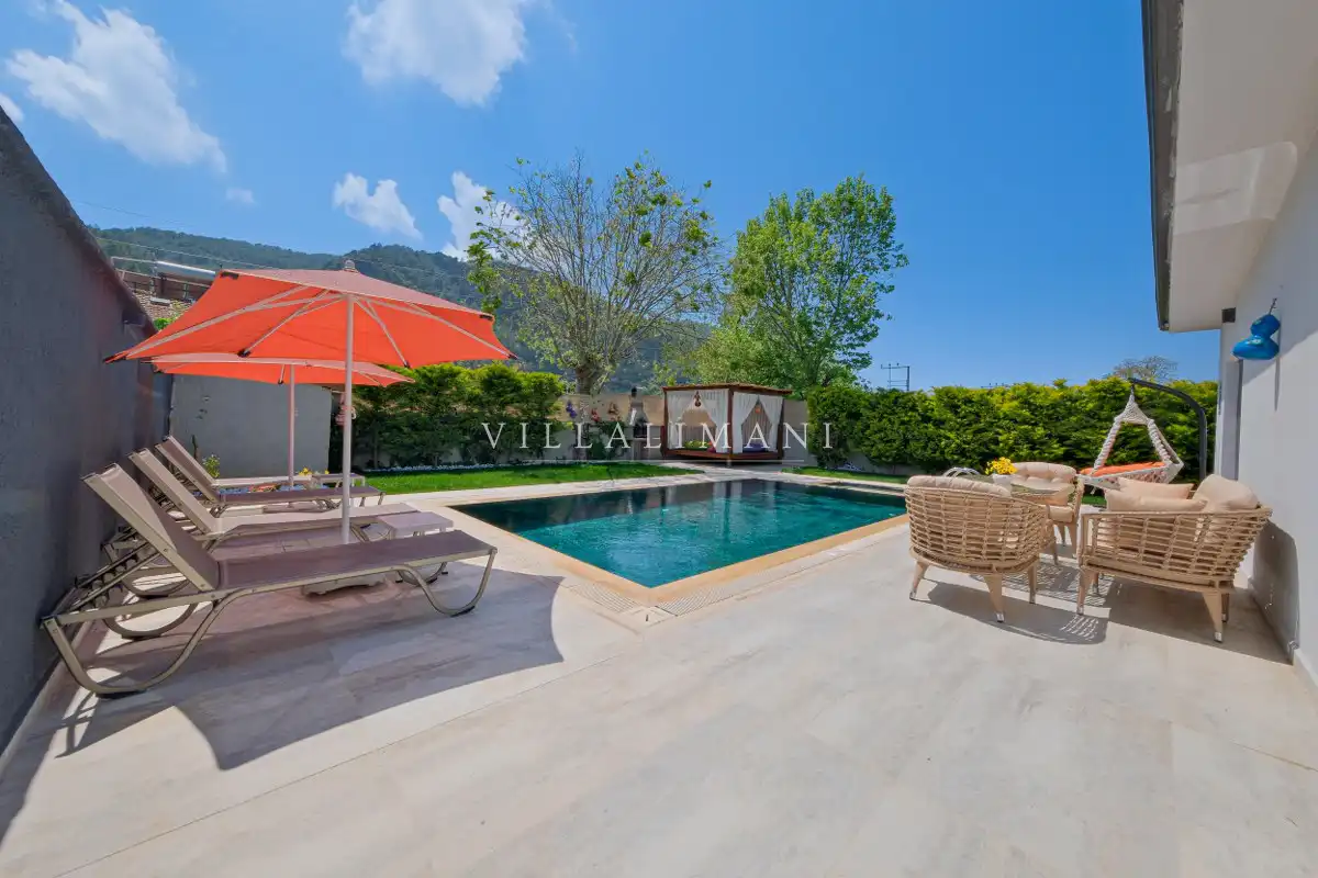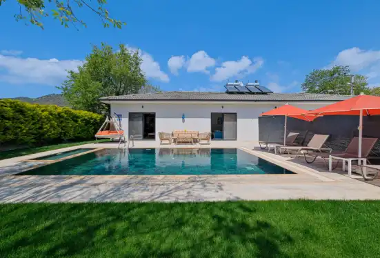 Havuz terasında kapasiteye uygun şezlong takımı, konforlu oturma grubu barbekü bulunmaktadır. Konforunuz gözetilerek tasarlanmış olan muhafazakar havuz alanına açılan ferah oturma odası, tam donanımlı açık mutfak; bir yatak odasında çift kişilik yatak, ebeveyn banyosu; ikinci yatak odasında da iki tek kişilik yatak ve ebeveyn banyosu bulunmaktadır. Villa, ihtiyaçlarınıza tam karşılık verecek donanıma sahiptir.