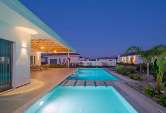 NOT : Bölgede aynı özelliklere sahip toplam 19 adet villa bulunmaktadır. Her villa özel havuzlu olarak hizmet vermektedir. Aynı iç ve dış dekorasyona sahip villamız için ortak görseller kullanılmıştır.