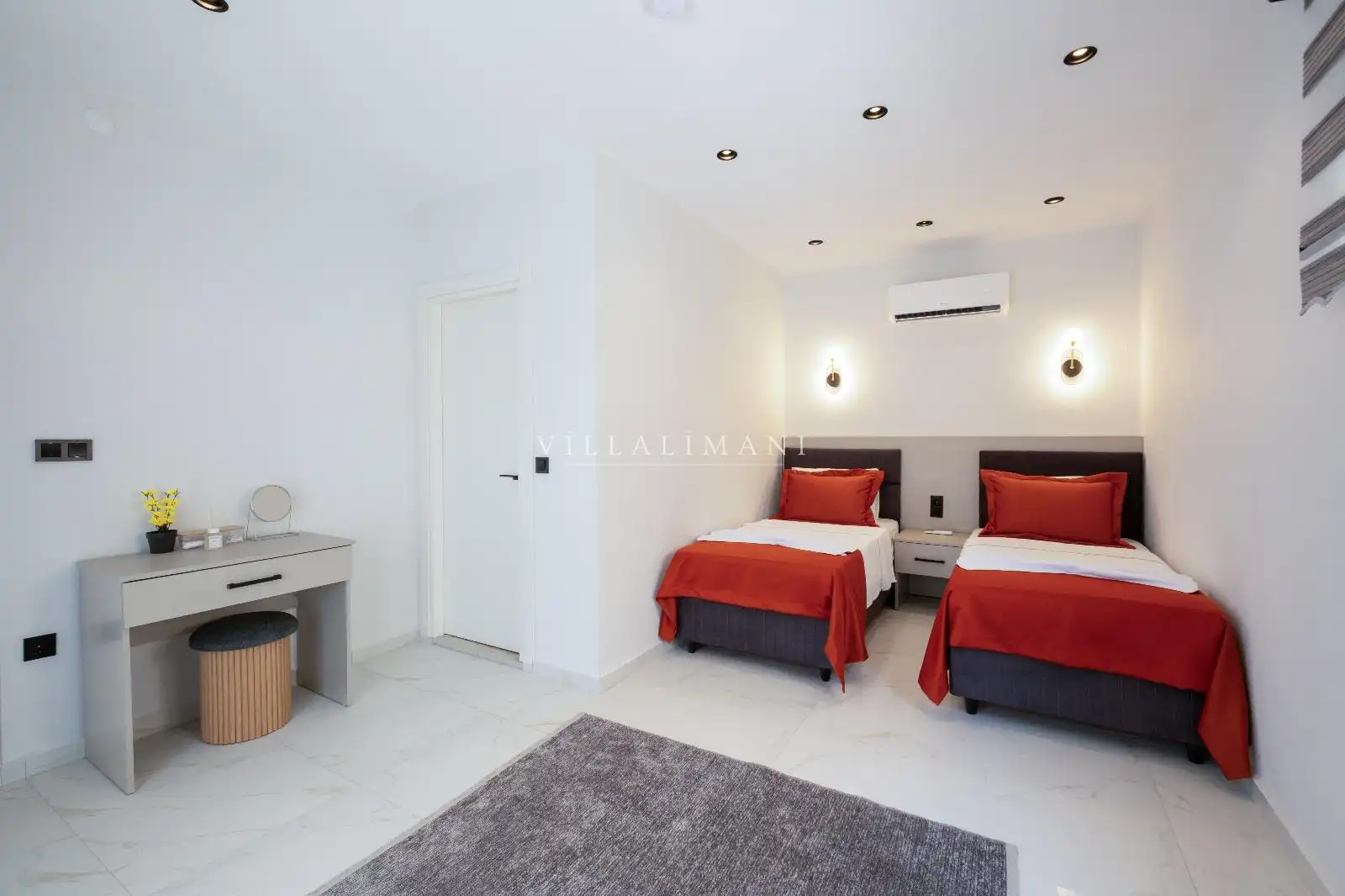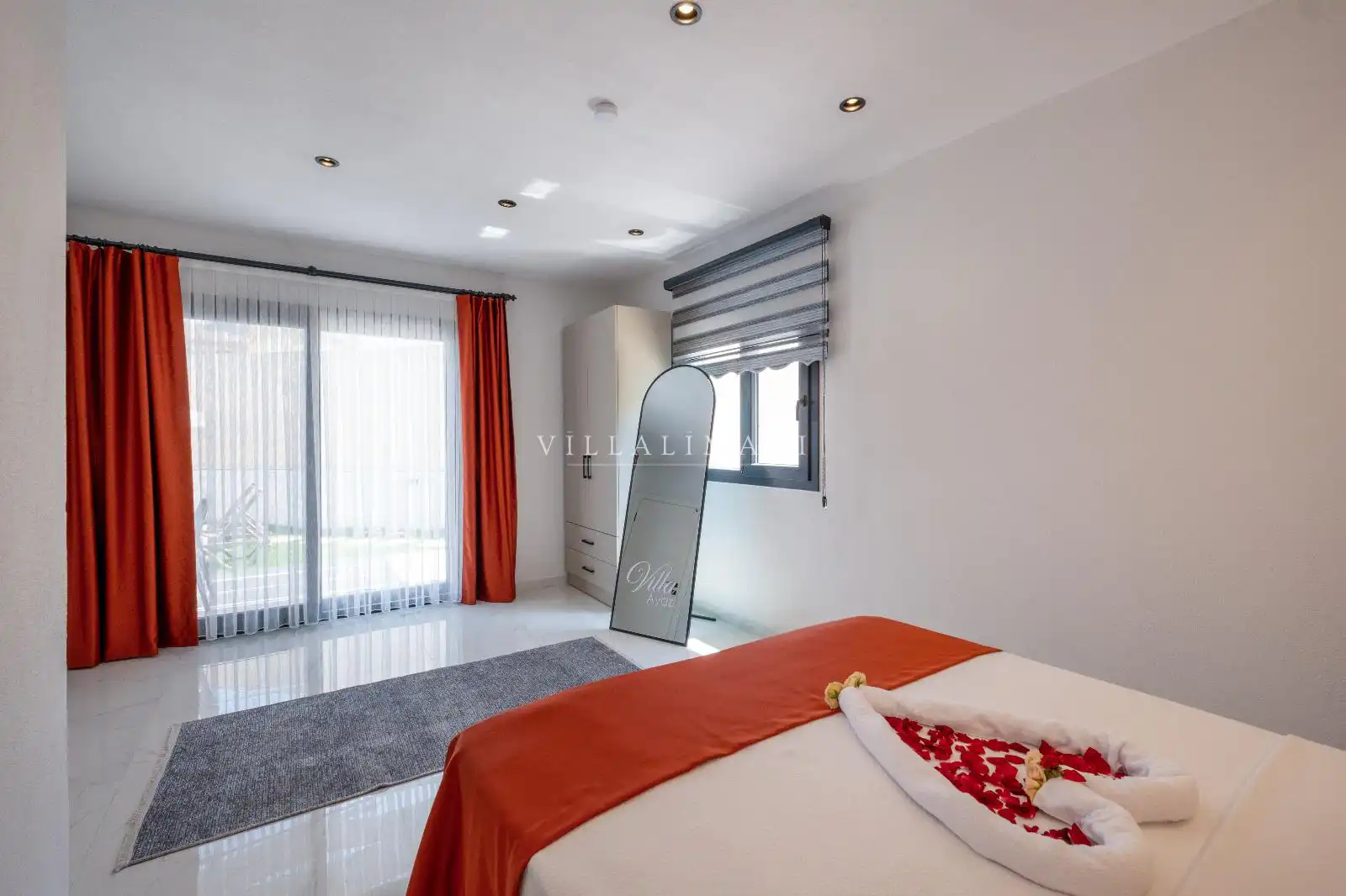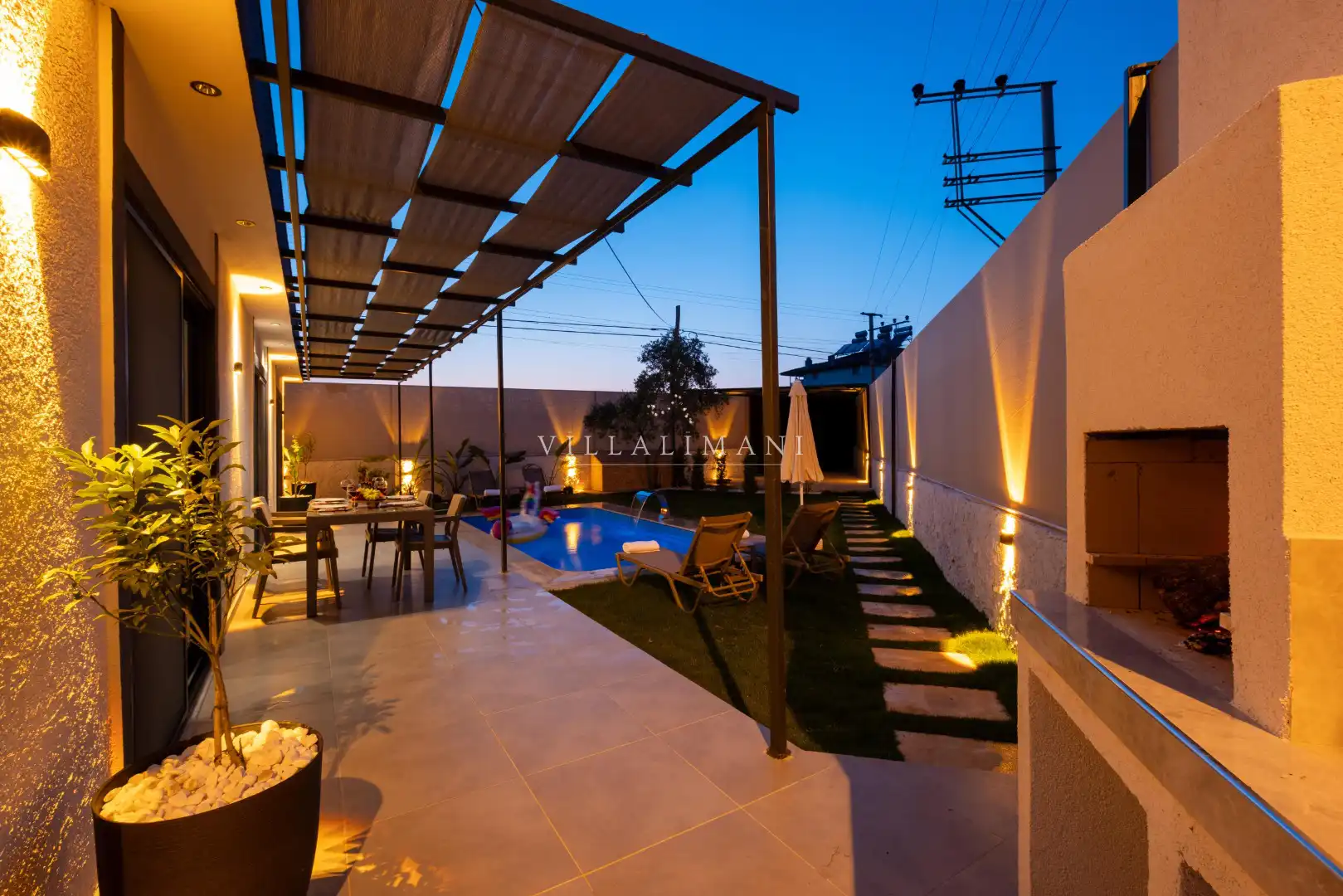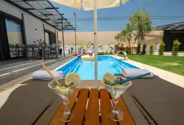 Korunaklı havuz alanına sahip olan villa, havuz terasına açılan lüks ve konforun uyumu ile döşenmiş şık oturma odası ve tam donanımlı mutfağı, birinci yatak odasında da çift kişilik yatak ve ebeveyn banyosu; ikinci yatak odasında iki tek kişilik yatak ve ebeveyn banyosu bulunmaktadır. Oldukça ferah ve geniş bahçe alanında kapasiteye uygun şezlong takımı, oturma grubu ve barbekü alanına sahiptir.
