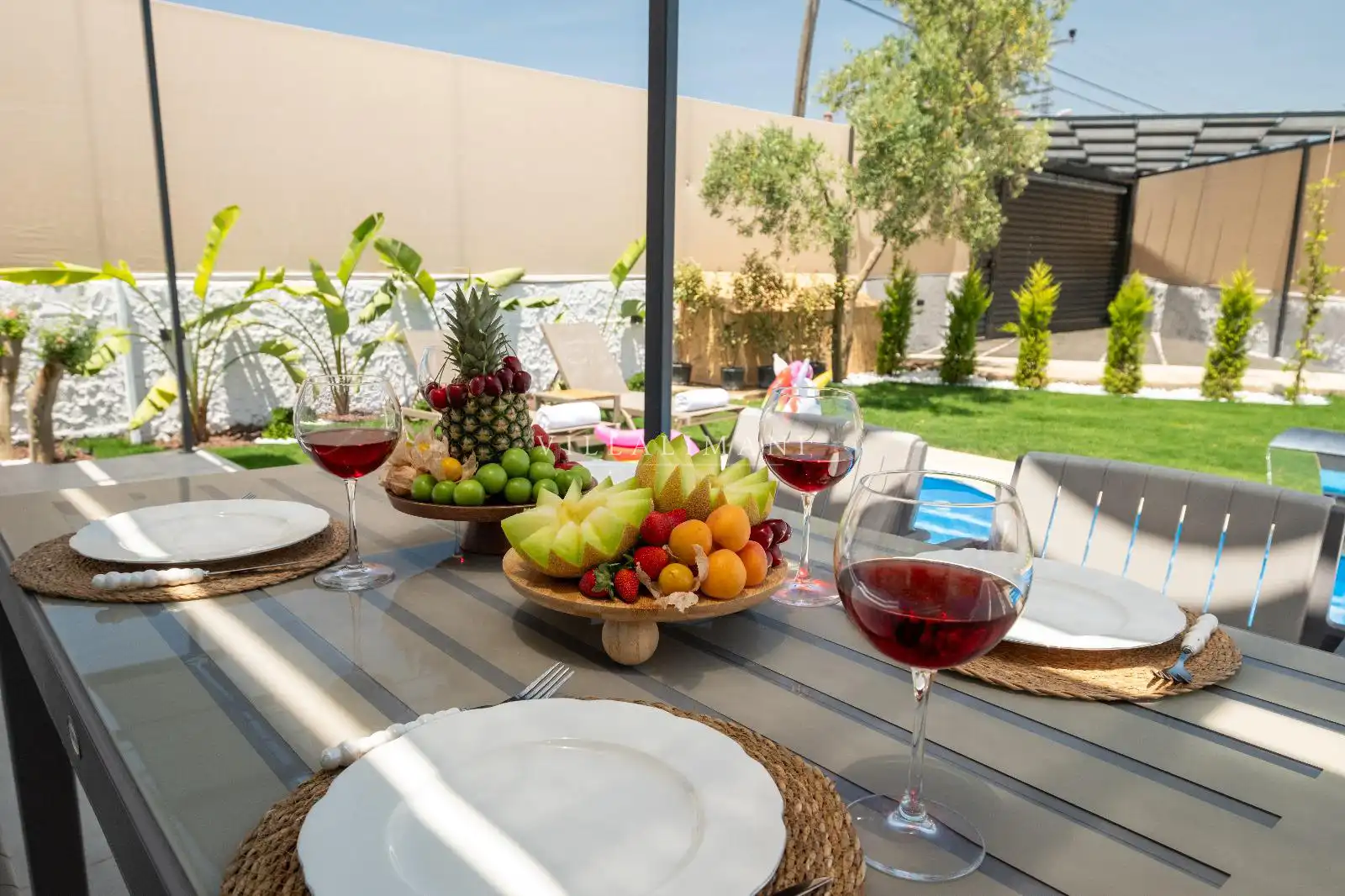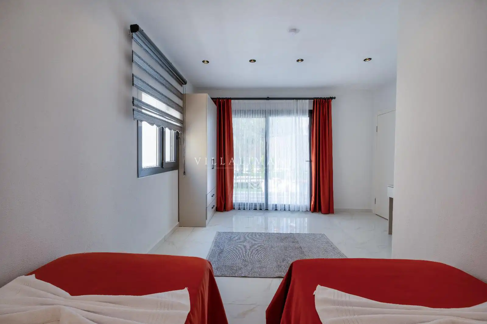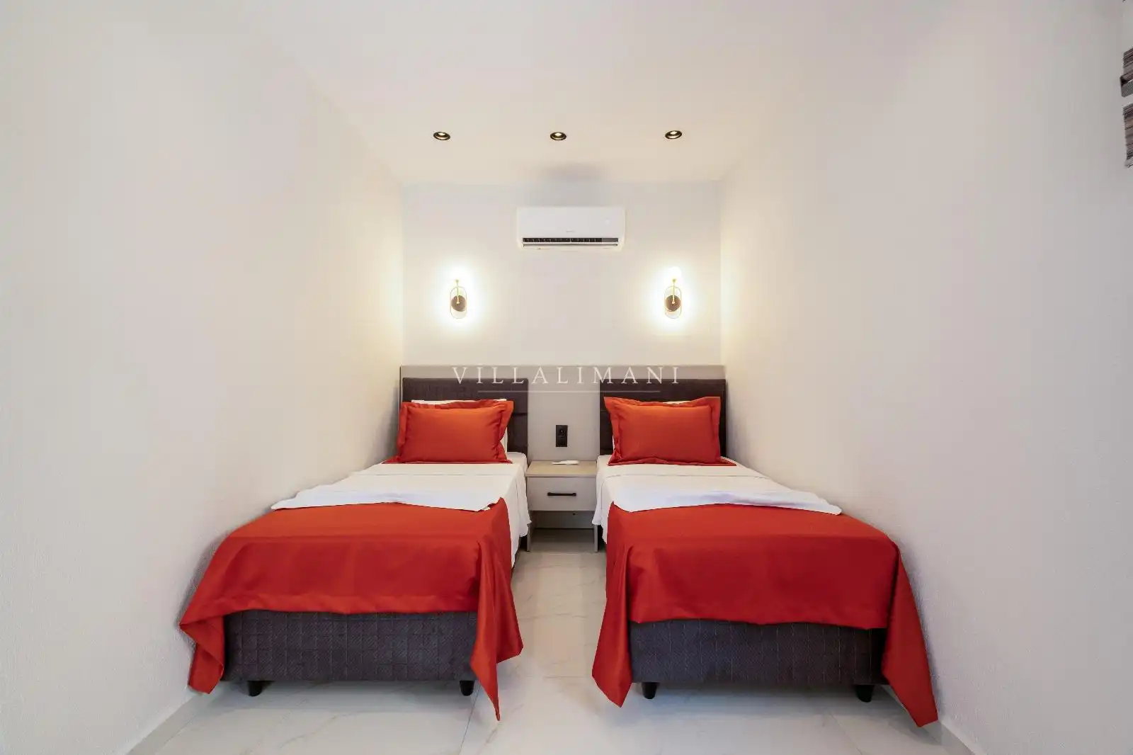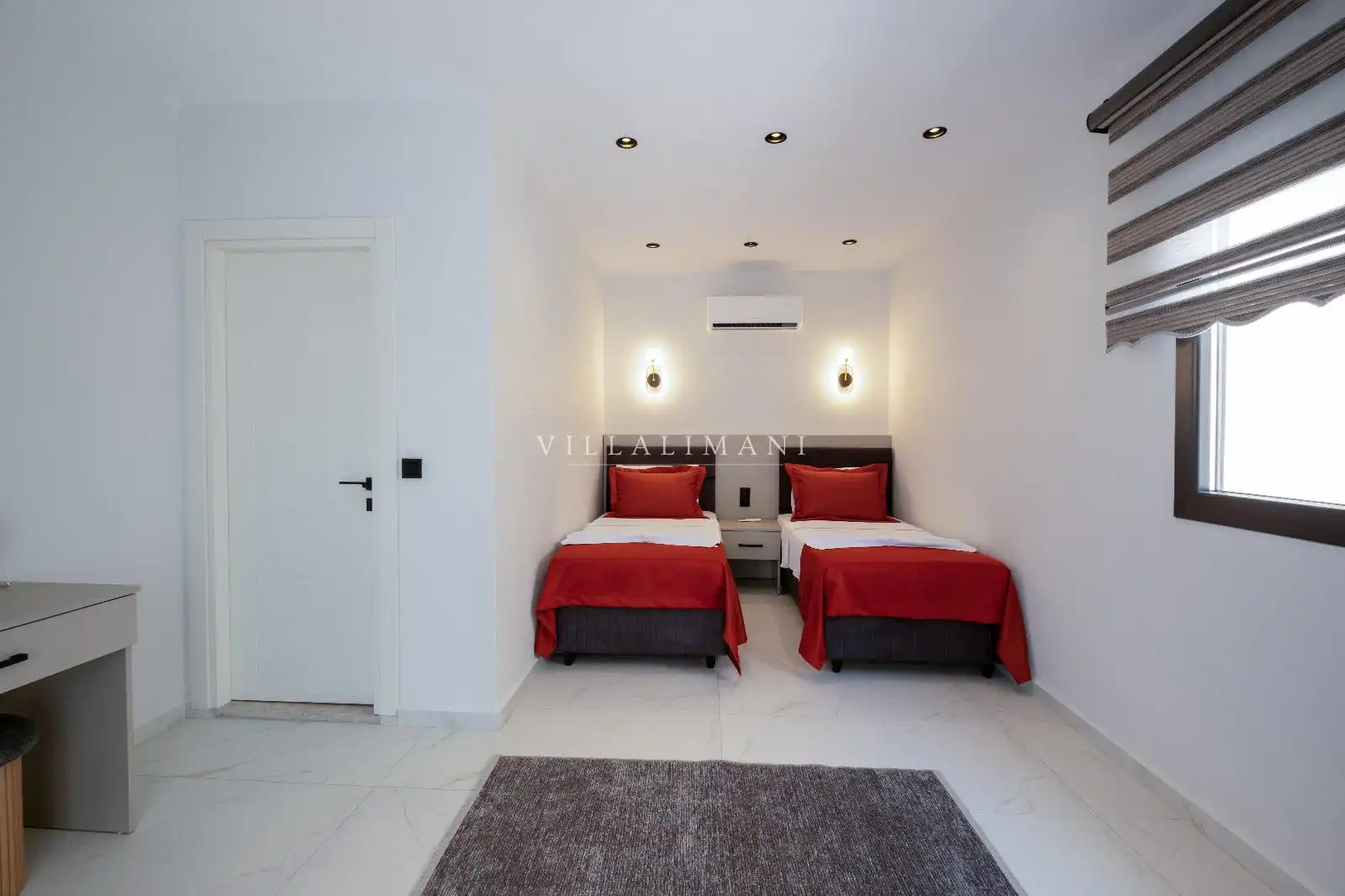 Korunaklı havuz alanına sahip olan villa, havuz terasına açılan lüks ve konforun uyumu ile döşenmiş şık oturma odası ve tam donanımlı mutfağı, birinci yatak odasında da çift kişilik yatak ve ebeveyn banyosu; ikinci yatak odasında iki tek kişilik yatak ve ebeveyn banyosu bulunmaktadır. Oldukça ferah ve geniş bahçe alanında kapasiteye uygun şezlong takımı, oturma grubu ve barbekü alanına sahiptir.