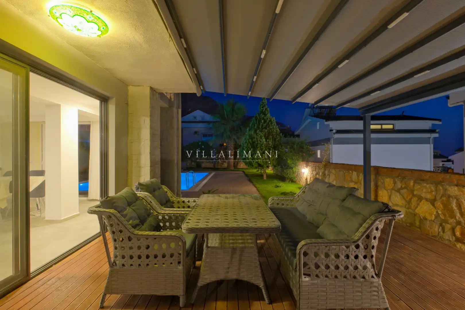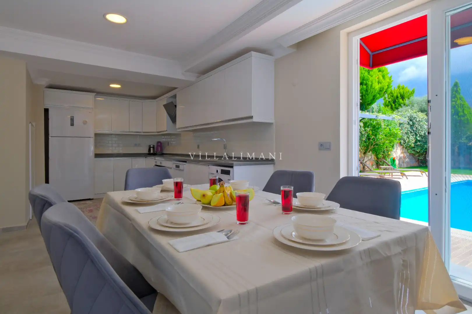 Fethiye'nin muhteşem doğasında şehir kargaşasından uzak bir tatil geçirmenizi sağlayacak olan villamızın havuz ve bahçe kısmında kapasiteye uygun oturma grubu, şezlong takımı, barbekü alanı mevcuttur. Ayrıca havuz terasına açılan, her ayrıntısı özenle tasarlanmış ferah bir oturma odası ve tam donanımlı açık mutfağı bulunmaktadır.