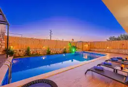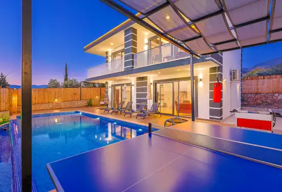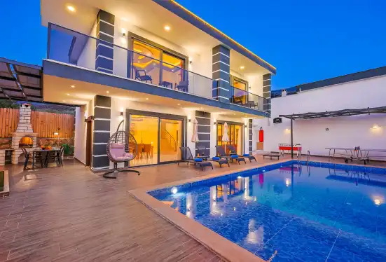 Korunaklı ve geniş bahçe alanına sahip olan villada, kapasiteye uygun oturma alanı, şezlong takımı, havuz terasında açılan konforlu oturma odası,ihtiyaçlarınızı karşılayacak donanıma sahip mutfağı, bahçe alanda masa tenisi, langırt, tranbolin, dart, boks torbası, çocuk oyun alanı bulunmaktadır. Birinci yatak odasında çift kişilik yatak, ebeveyn banyosu ve jakuzi; ikinci yatak odasında ise iki tek kişilik yatak ve evebeyn banyosu bulunmaktadır.